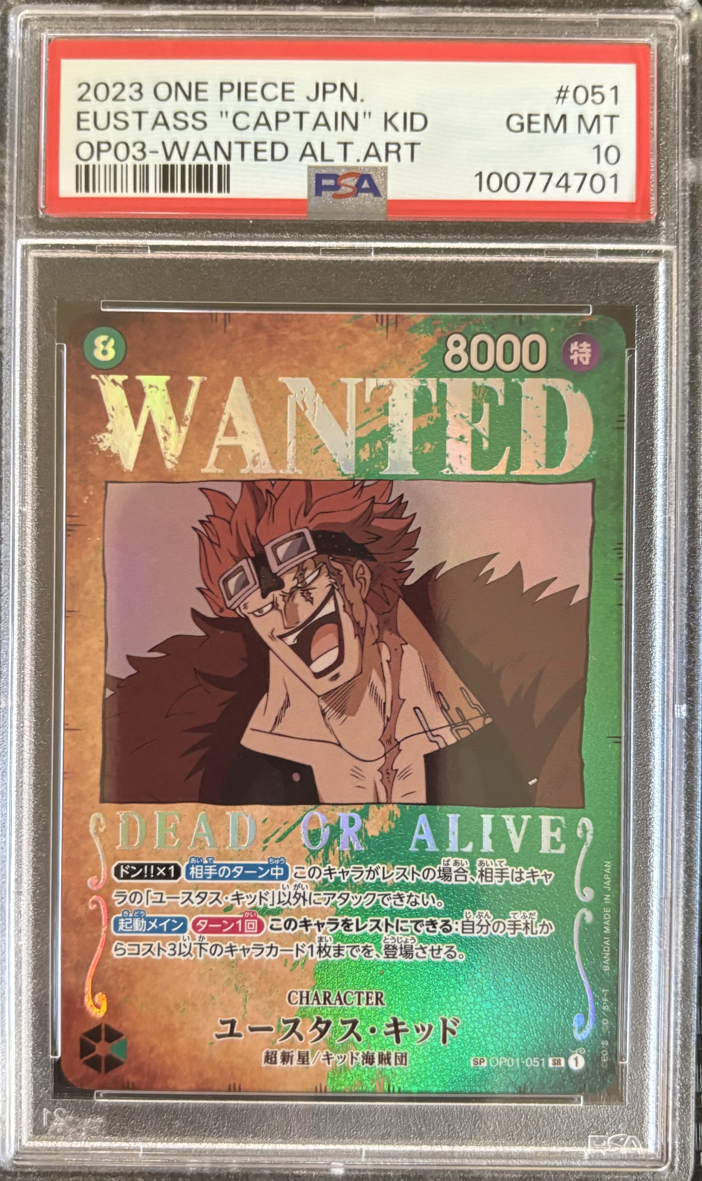 Descubre una verdadera joya para los fanáticos de One Piece: la exclusiva carta coleccionable japonesa de Eustass 'Captain' Kid, edición alternativa 'Wanted' del año 2023. Esta carta cuenta con un impresionante diseño holográfico que resalta cada detalle del icónico personaje, convirtiéndola en una pieza única para cualquier colección. Calificada con la máxima puntuación GEM MT 10 por PSA, garantiza su estado impecable y su alto valor de coleccionismo. Ideal como regalo o inversión, su tamaño estándar (aprox. 63 x 88 mm) permite exhibirla fácilmente junto a otras cartas. No te pierdas la oportunidad de añadir este artículo exclusivo y de edición limitada a tu colección.