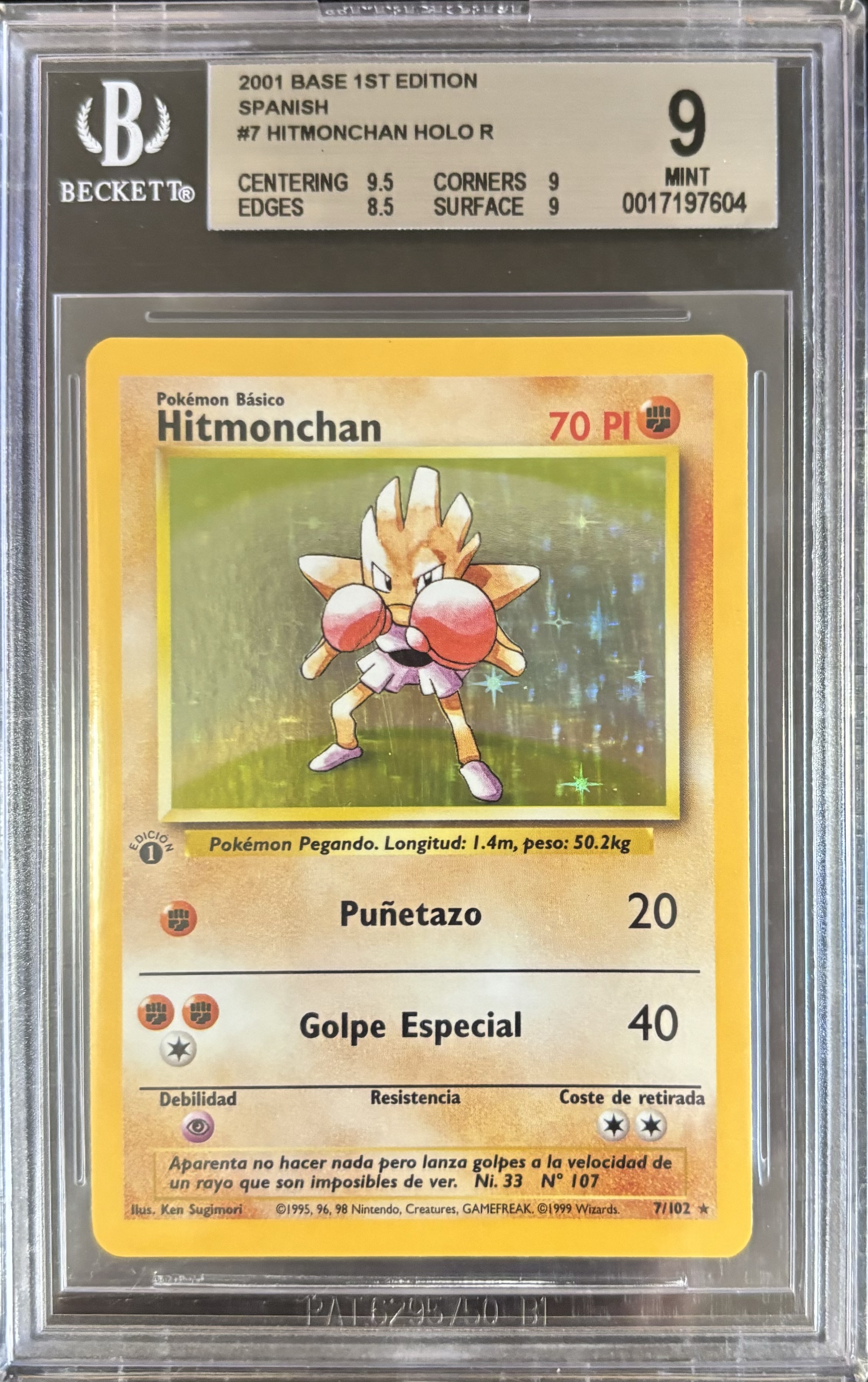 Descubre una auténtica joya para tu colección: carta Pokémon Hitmonchan 1ª Edición Base en español, edición holográfica rara de 2001. Esta pieza exclusiva ha sido evaluada y calificada con una impresionante nota de 9 (Mint) por Beckett, garantizando su estado excepcional y originalidad. Su brillante efecto holográfico realza la imagen de Hitmonchan sobre un fondo multicolor, convirtiéndola en una pieza llamativa y codiciada. Tamaño estándar de carta coleccionable (6,3 x 8,8 cm), cuidadosamente conservada y perfecta tanto para coleccionistas exigentes como para apasionados del universo Pokémon. Aprovecha esta oportunidad única de añadir a tu colección una de las cartas más emblemáticas y difíciles de encontrar en este estado de conservación.